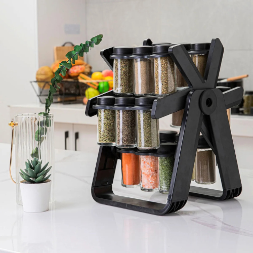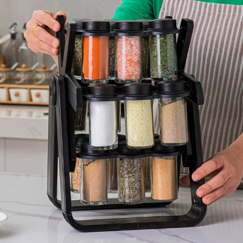 Organiza tus especias y condimentos en un solo lugar. Base giratoria 360°, frascos de vidrio, diseño vertical que ahorra espacio y facilita cocinar.